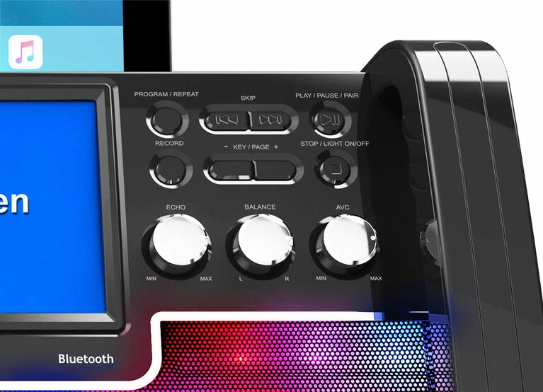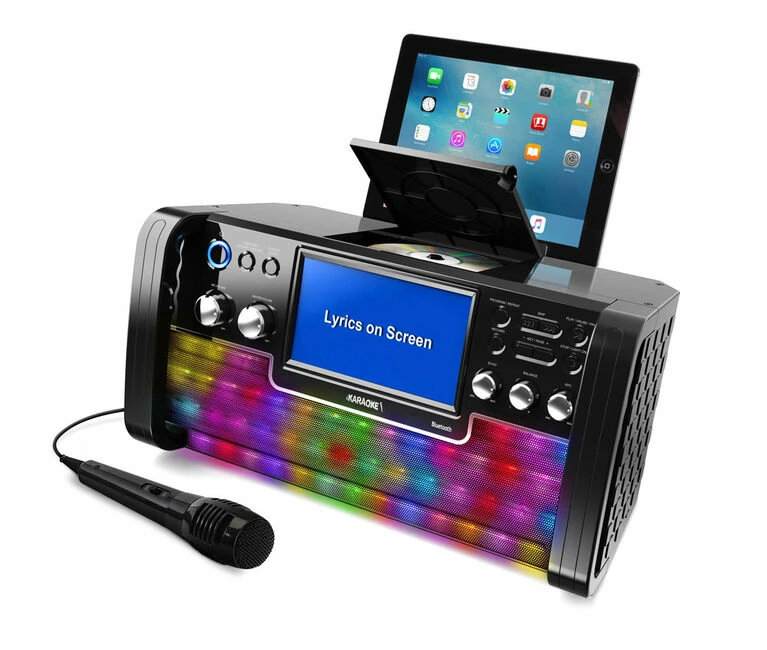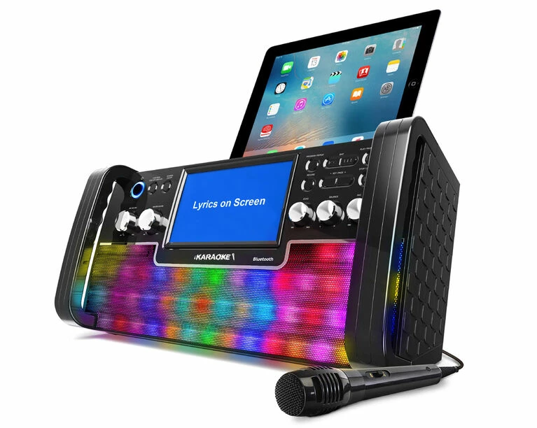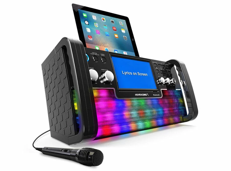 R Exclusive, only available at Toys R Us Canada. Become the star of your next Karaoke party with the iKARAOKE KS780-BT Karaoke System. This unit has all of the features needed to sing and share your performance with your family and friends. The top loading CD/CD&G player plays your favorite music and Karaoke CD&G’s, and when connected to your TV with the supplied cables, you can sing along to the lyrics displayed on your TV screen. The KS780-BT has a big 7″ Color Screen that will display the lyrics for you when using a Karaoke CD&G. When you prefer to use the KS780-BT as a Bluetooth speaker, just connect your Bluetooth enabled smartphone or tablet, drop them in the supplied cradle and get the party started. If your favorite music happens to be on a USB travel drive, we got you covered. Just plug your travel drive into the USB port and play your favorite MP3/MP3&G music. The USB port can also be used to record your karaoke performance, so you can share with your family and friends. The multi color lighting effect will add the ambiance as it pulsates to the beat of the music. The KS780-BT includes a wired microphone, cradle, RCA cord for connection to your TV, Demo CD&G and AC Power Cord.