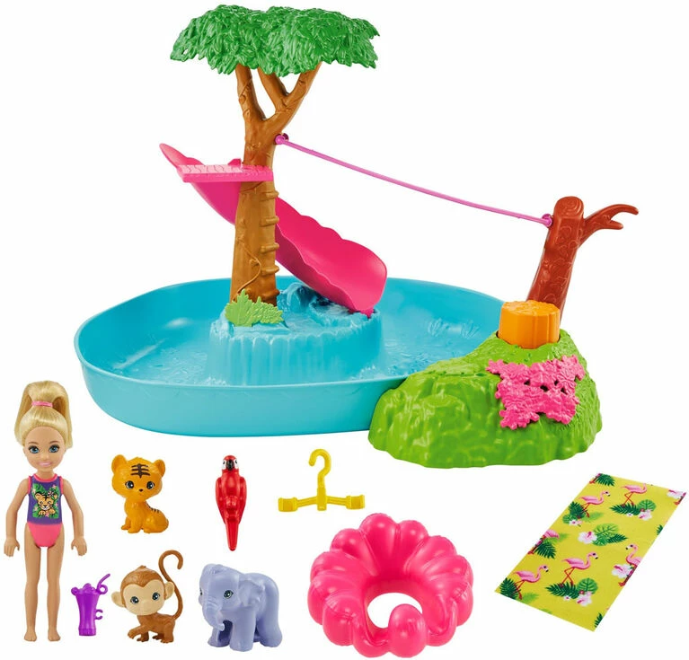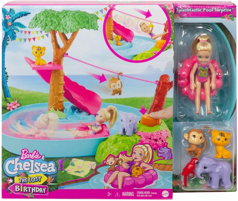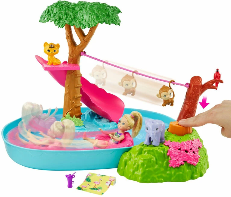 This Barbie and Chelsea The Lost Birthday Splashtastic Pool Surprise playset takes 3 to 7 year olds on a jungle river adventure packed with fun and animal friends! Chelsea doll is ready for a fun day on the water with her baby monkey, elephant and tiger friends -there’s even a parrot that can perch on the tree. Kids can fill the playset with water so Chelsea doll and her animal pals can swim, slide and float around the island. There are lots of adventures to be had -help them climb the tree to slide down into the river or zipline to the other side! Chelsea doll bends at the hips to sit comfortably in her floatie as she floats around the river, and a beverage and towel accessory let kids play out their stories with realistic detail. Doll cannot stand alone. Colors and decorations may vary