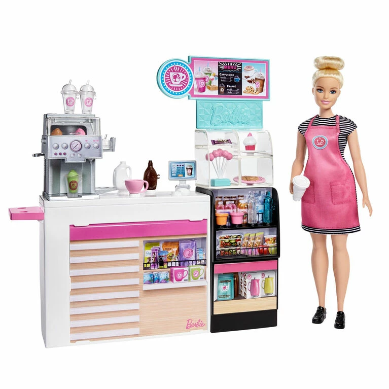 Explore a world of coffee shop fun with the Barbie Coffee Shop Playset! If you love making coffee and smoothie drinks, then you can run a coffee shop! The Barbie Coffee Shop Playset includes Barbie doll wearing a cute black-and-white striped shirt and a pink apron with a sporty bun hairdo. And Barbie doll is ready to serve her customers! The coffee shop has a menu board and machine to make coffee, smoothie drinks and tea (turn the dial on the machine to choose favorite drink flavors). Additional accessories include a jug of milk, chocolate syrup, coffee cups, smoothie cups, a tea cup and more. There’s also a section with sweet treats including cake pops, a cupcake and cookies; a cold section that holds 2 bottled waters; and a snack section and power bar. When a customer has made their selection and the order is ready, Barbie doll can ring them up at the register! The coffee shop playset has 20+ storytelling pieces (some have a clip-on feature that lets Barbie doll hold the item). Kids will love the endless possibilities for creative expression and playing out the coffee shop fun! Makes a great gift for ages 3 years old and up especially those who love making coffee, serving treats and learning cooking skills! Dolls cannot stand alone. Colors and decorations may vary.