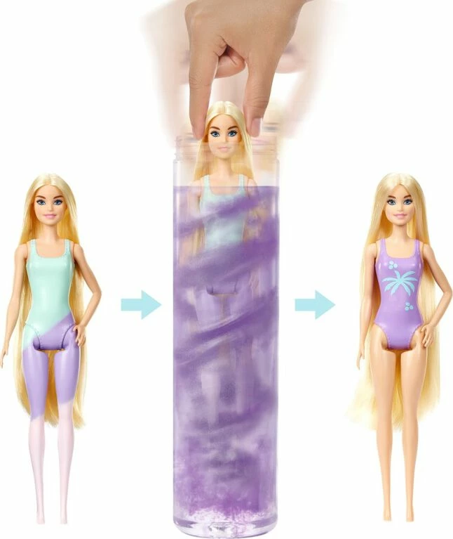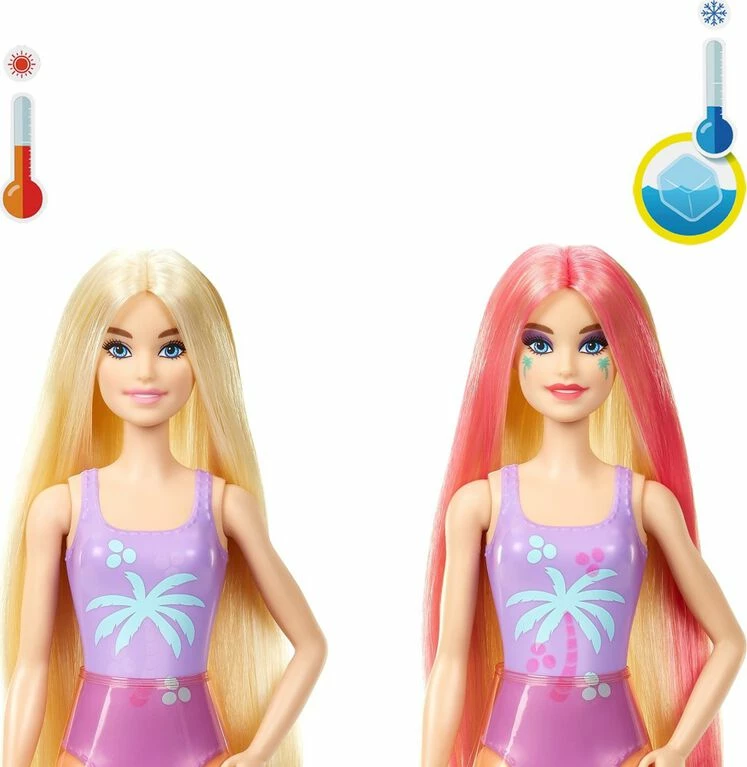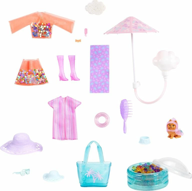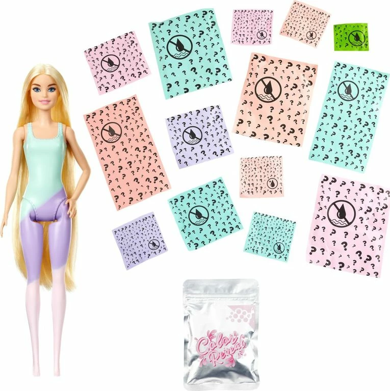 Barbie Color Reveal Sunshine and Sprinkles gift sets deliver the ultimate unboxing experience with 25 surprises -open sunshine and cloud-shaped boxes to find 15 mystery bags hiding surprises inside and a Barbie Color Reveal tube! Take the Barbie Color Reveal doll covered in a pastel ombre coating out of the tube, fill the tube with warm water, then insert the doll and swirl her around. The water changes into three pastel colors for a magical ombre effect, and when the doll is pulled out, her features are revealed! Unbox for more surprises and find the umbrella with an attachable squishy cloud -fill the cloud with water and squeeze to create a rain shower. Other surprises include a squishy pet puppy, a mini pool, water beads, vinyl and confetti fashions and accessories. And the surprises continue…use icy cold water to activate four color-change features: Barbie doll’s face, bodice and hair and the pet’s raincoat. With the use of warm and icy cold water, kids can repeat the wow color-change moments over and over again! Each sold separately, subject to availability. Dolls cannot stand alone. Colors and decorations may vary.