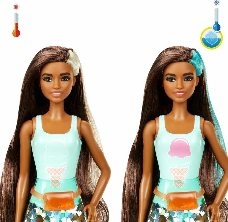 Barbie Color Reveal Sunshine and Sprinkles gift sets deliver the ultimate unboxing experience with 25 surprises -open sunshine and cloud-shaped boxes to find 15 mystery bags hiding surprises inside and a Barbie Color Reveal tube! Take the Barbie Color Reveal doll covered in a pastel ombre coating out of the tube, fill the tube with warm water, then insert the doll and swirl her around. The water changes into three pastel colors for a magical ombre effect, and when the doll is pulled out, her features are revealed! Unbox for more surprises and find the umbrella with an attachable squishy cloud -fill the cloud with water and squeeze to create a rain shower. Other surprises include a squishy pet puppy, a mini pool, water beads, vinyl and confetti fashions and accessories. And the surprises continue…use icy cold water to activate four color-change features: Barbie doll’s face, bodice and hair and the pet’s raincoat. With the use of warm and icy cold water, kids can repeat the wow color-change moments over and over again! Each sold separately, subject to availability. Dolls cannot stand alone. Colors and decorations may vary.