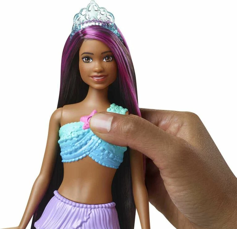 Imaginations can dive into storytelling with Barbie Dreamtopia Twinkle Lights Mermaid Doll featuring a magical light-up feature! Dip this beautiful Barbie mermaid doll in water to see her pearlescent tail glimmer with one of four colorful light shows. Barbie Dreamtopia Twinkle Lights Mermaid Doll makes a splash in the tub or pool, but kids can also bring the fun ashore — push the star-shaped button on Barbie doll’s bodice to enjoy the light show without water. Rainbow fins, pink-streaked hair and a princess tiara complete Barbie doll’s colorful mermaid look. Perfect for bath time or water play (parental supervision required), Barbie Dreamtopia Twinkle Lights Mermaid Doll makes a great gift for kids ages 3 to 7 years old. Doll cannot swim or stand alone. Colors and decorations may vary.