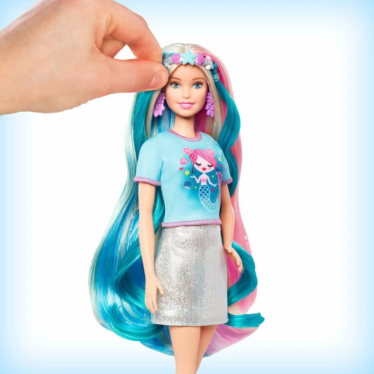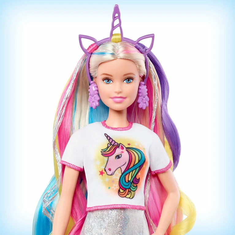 Unicorn or mermaid Barbie Fantasy Hair doll doesn’t need to choose – she comes with two fantasy looks that each include – colorful crown with hair extensions, themed top and accessories. The transformation to – mermaid or unicorn is easy! Put on the t-shirt with the unicorn graphic or use the one with the mermaid, then add the matching headpiece. The colorful hair extensions on the crown add even more colors to the pink, blue and glittery streaks in Barbie doll’s long blonde hair. The set includes – brush, elastic hairbands and two clips so kids can create fantasy hairstyles, plus – pair of sneakers to expand the storytelling and styling options. Kids – to – years old will love switching up Barbie doll’s look and sending her out to shine! Includes Barbie doll wearing fashion and accessories, two crowns with hair extensions, two graphic t-shirts, – second pair of shoes, elastic hairbands, two hair clips and – brush. Doll cannot stand alone. Colors and decorations may vary.