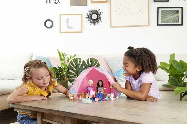 Head to the great outdoors with this Barbie It Takes Two playset featuring Barbie “Malibu” Roberts doll, Barbie “Brooklyn” Roberts doll, their very own tent and tons of themed accessories! Decorated with an awning and string lights, the extra-large, fabric camping tent features room for four dolls. Kids can set up camp, then play out starry night camping stories with folding chairs, a telescope, firepit, marshmallow roasters, a card game and more. Two woodland animals might even pop in to visit! With two dolls in cute camping looks and so many accessories, kids ages 3 years old and up can dream up endless outdoor adventures. Dolls cannot stand alone. Colors and decorations may vary.