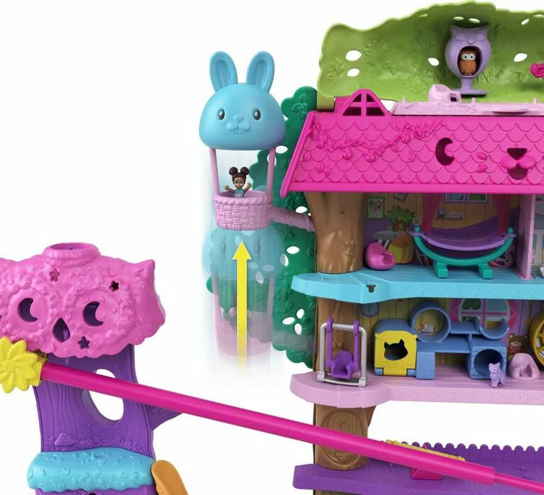 The Polly Pocket Pollyville Pet Adventure Treehouse playset is filled with loads of fun and activities for the pets! There is a total of FIVE floors for play plus a unique way to expand the playset to make it the ultimate big treehouse! Included are Polly and Shani micro dolls, 4 adorable animal figures, 9 accessories for pet party fun and 1 swan vehicle. The action starts by driving the swan vehicle over the speed bump to expand the playset and trigger a zipline plus driving over a second speed bump expands the waterfall slide. Kids can explore hidden surprises and play spaces on five floors and in areas like the hidden escape slide in the doghouse, treetop lookout, rock climbing area, hot air balloon ride, basket swing, secret storage and more. Colors and decorations may vary. Makes a great gift for ages 4 years old and up.