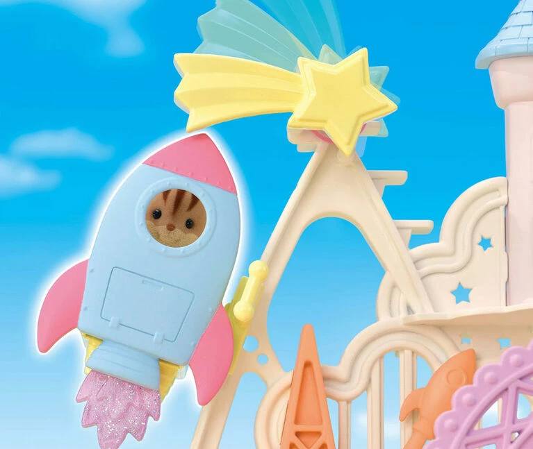 Amusement Park is the newest series from Calico Critters that brings whimsical design and vibrant fun to Calico Land! Baby Amusement Park Series is a ready to play amusement park playset for baby figures which features mechanical rides for the babies to enjoy! Set includes 3 poseable twin baby figures including Pookie Panda baby, Persian Cat baby and Sweetpea Rabbit baby. Four main amusement park attractions for babies to ride including the rotating Ferris Wheel with three gondolas, rocking Pirate Ship, Rocket Launcher and Go-Karts. Ride the Go-Karts to the back of the amusement park to find a place for babies to spend time while they are not riding rides. Features space for up to 30 Calico Critters babies figures. Play together with amusement park playset and figures including Baby Star Carousel, Royal Carriage, Fairytale Friends and more!