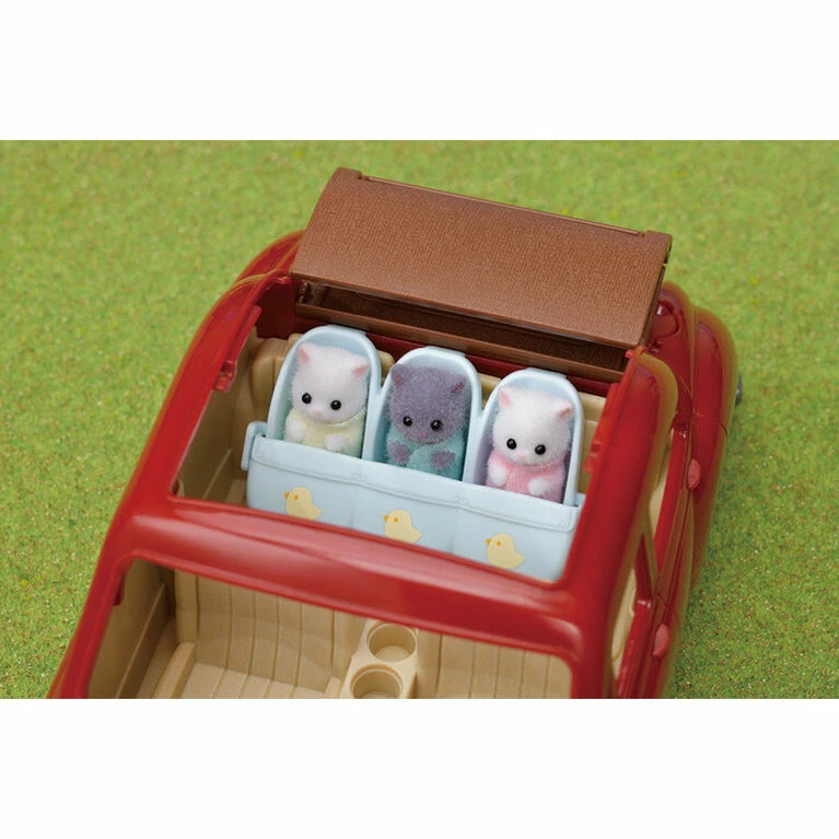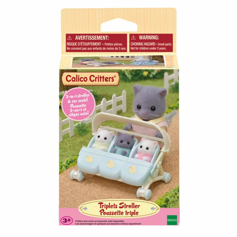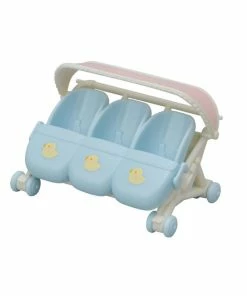 Stroll around Calico Village in the Triplets Stroller! The Triplets stroller is compatible with cradled baby triplets from Calico Critters including the Persian Cat Triplets and Marshmallow Triplets. This accessory set includes 4 pieces including the baby blue stroller with sunshade, seats and seat cover. 2-in-1 functionality allows the triplet seats to be removed and used as a car seat in vehicles including the Family Cruising Car and Family Campervan. Once the seats have been removed from the stroller, the base of the stroller can be used to fit twin sized figures from Calico Critters.