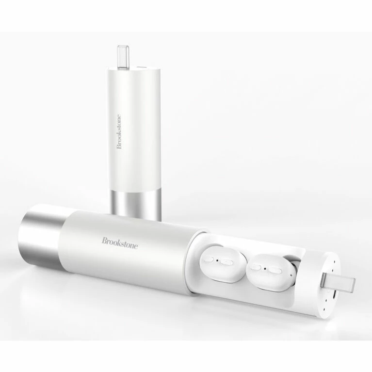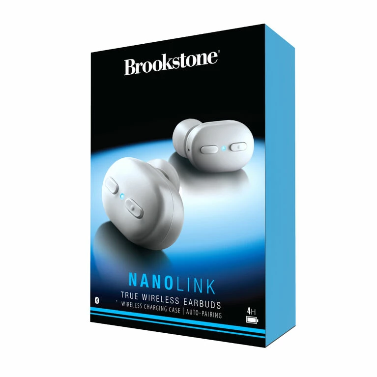 The Brookstone NanoLink True Wireless Earbuds, are a sleek streamlined and simple way to listen to your music, in style. With autopair technology, these earbuds will pair directly to your device out of the case and keep you listening for up to 4 hours. Need more than 4 hours of listening time? No problem! The included charge carry/transport case, provides up to 4 recharges for the earbuds, when fully charged itself. The small case fits right in your pocket making these the perfect earbuds for commutes, around the office, or plane and car rides. With Bass+ technology, on-ear controls, hands free calling – thanks to the embedded mics- you can be sure these earbuds will cover and exceed your every day needs.