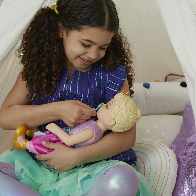 When will she grow into a gorgeous princess? Baby Alive Princess Ellie Grows Up! talking doll grows little by little with kids’ care and responds with 75+ sounds and phrases. A twinkly chime plays whenever she grows! As a baby, she slowly grows with rocking, giving her a pacifier and pretending to feed her with her sippy cup and bowl/spoon. Bouncing movements and pretend feeding/drinking will help her keep growing as she gets taller. Kids ages 3 and up will have fun tracking her height with the included growth chart and styling her with dress-up baby doll accessories! Place her brushable tiara hair extension on her head and put the princess skirt over her outfit to complete her royal look. Instructions and quickstart guide help kids care for their growing doll and reset her to play again! This 18-inch (45 cm) Baby Alive doll that grows up is an exciting toy for girls and boys, and a great gift for birthdays and holidays.