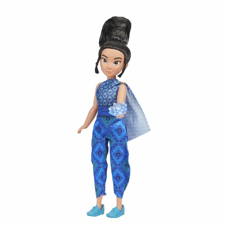 Inspired by Disney’s Raya and the Last Dragon animated movie, Young Raya and Kumandra Flower pays homage to her hopeful adolescent character. When kids lift her arm, she will play soothing music and the Kumandra flower in her hand, which represents hope in the movie, will light up. The musical fashion doll has brown hair pulled back in an updo and 5 points of articulation. She includes fashion doll clothes — a striking blue jumpsuit with matching shoes.
