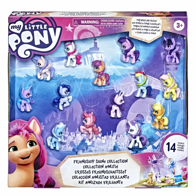 Friendship Shine Collection pack includes 14 pony figures with character-inspired colors, hair styles, and Cutie Marks. From My Little Pony: A New Generation, meet Sunny Starscout, Izzy Moonbow, Princess Petals, Zipp Storm, and Queen Haven. Also includes Sunny’s Dad, Argyle Starshine! From My Little Pony: Friendship is Magic, reimagine the magic of Twilight Sparkle, Applejack, Fluttershy, Rarity, Pinkie Pie, Rainbow Dash, Starlight Shimmer, and Trixie Lulamoon.