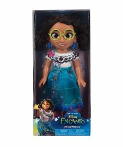 Mirabel Madrigal from Disney’s Encanto comes wearing her signature outfit and accessories! Just like in the film, Mirabel’s dress features a beautiful scalloped collar and sleeves with authentic embroidery-style designs. Her long teal skirt features colorful icons and patterns inspired by her family’s magical gifts, just like in the film! Look closely at the designs, and you’ll find Mirabel’s name printed onto her skirt, just like her dress in Encanto! Her bright green glasses and magenta espadrille shoes complete her classic look. With your new friend Mirabel Madrigal, you can pretend to go on your own magical adventures