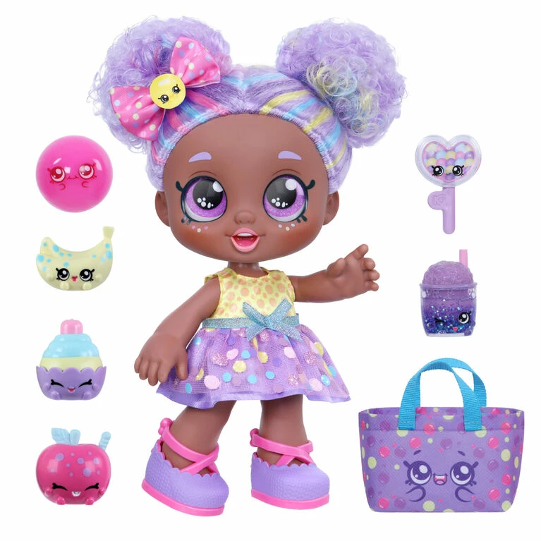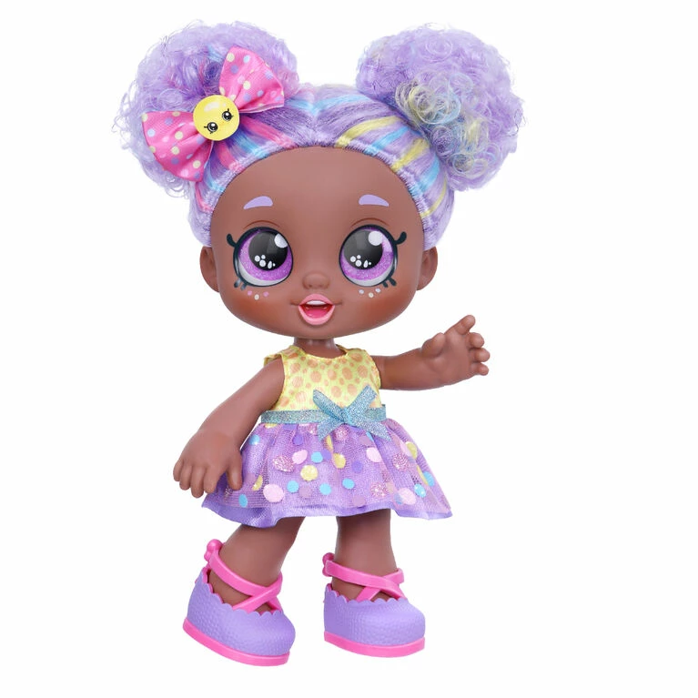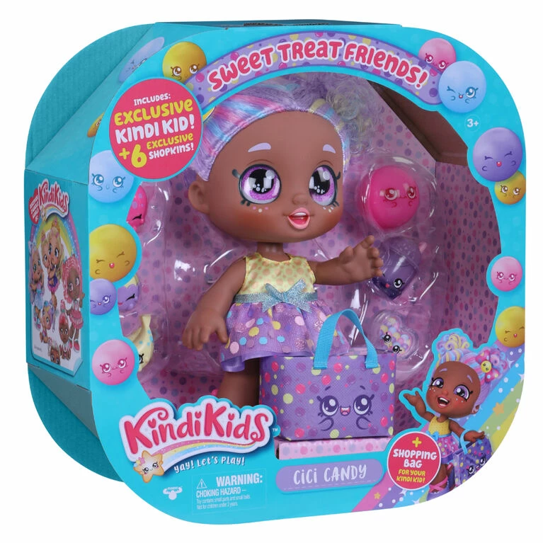 Yay! Let’s Play! Kindi Kids Sweet Treat Friends are the cutest Pre-Schoolers around! Cici Candy is an adorable little girl who’s full of fun and play and loves to go shopping with her Shopkins! Pick her up and see her come to life! With big, glittery eyes, beautiful colorful hair and an adorable head that bobbles with every movement, She is all set to help you get ready for Kinder! Cici Candy is a rainbow candy sweetheart! Nothing seems to faze her sugary disposition and she can bounce back from any situation. When you’re friends with Cici Candy, you’re friends for life! This exclusive Kindi Kid has her own brightly colored Shopping Bag that matches her cute dress and comes with 6 exclusive, delicious Shopkin treats!