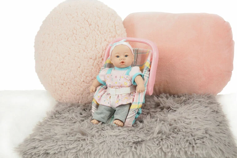 Set includes an adorable 8″ baby doll and a fun accessory: choose a crib or car seat/carrier. This can be your child’s ‘go anywhere” companion! Play bedtime or take baby on an outing! Car seat doll wears an adorable pink jumper, tee, leggings and headband; car seat is lined with pastel plaid fabric and can be adjusted to sit up for feeding or down for a nap. Crib doll comes in a patterned sleeper with cap, and crib with pastel plaid bedding. Lil’ Cuddles by Madame Alexander’s smallest doll is great for those occasions where a child’s full-size baby needs to stay at home. Take baby on visits to grandparents, in the car, to the store! Soft, cuddly, and sweet, our 8″ baby teaches kids to love, nurture and imagine. This 8″ doll has a soft fabric body with molded head and limbs, ready for cuddling. Beautiful realistic face has delicate features with bright set-in eyes. Each doll wears a removable printed jersey knit outfit with a headband and satin ribbon bow. Each doll is packed with a hangtag. Lil’ Cuddles by Madame Alexander dolls are made with ‘love in the details’ for your child to treasure. Our realistic, quality dolls are meant to be played with and loved, so children learn to form meaningful, enduring relationships. Few interactive features and simple accessories invite little ones to imagine a world of their own making. Our baby dolls are made to be played with safely and comfortably, with soft bodies and nontoxic materials. Doll play is important for all children to learn to love, nurture, and develop empathy. It is creative, opening up worlds of imagination to children by providing a special companion for their ideas. It helps build fine and gross motor skills as children progress from infant to toddler and beyond. Recommended ages: 2 and up. Spot clean doll with damp cloth, air dry. Hand wash apparel or machine wash gentle cycle, tumble dry low.