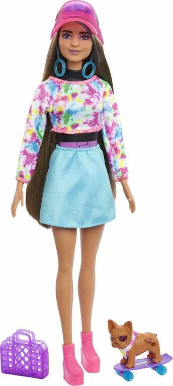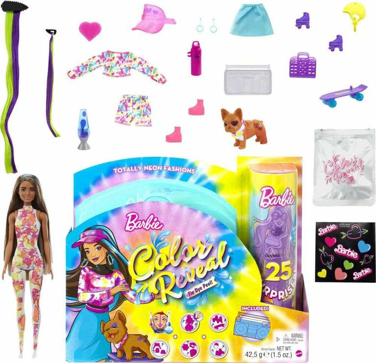 Barbie Color Reveal Totally Neon Fashions doll gift sets deliver the ultimate unboxing experience with 25 surprises -kids open the box to find 15 mystery bags hiding surprises inside them and a Barbie Color Reveal doll. Take the Barbie Color Reveal doll, partially covered in a neon tie-dye coating and peel to reveal the look! Then open the mystery bags to find a pet puppy, clear boombox-shaped case and slime-sand, puppy skateboard, roller skates, tie-dye fashions, doll, a sticker sheet and two hair extension clips, one for Barbie doll and one sized for kids to wear. And the surprises continue…use icy cold water to activate color-change features, like on Barbie doll’s face, sunglasses and the pet puppy. With the use of warm and icy cold water, kids can repeat the wow color-change moments over and over again! Use the pieces to style and storytell with Color Reveal Totally Neon Fashions Barbie doll and her puppy, both ready for a neon skate party. Each set sold separately, subject to availability. Dolls cannot stand alone. Colors and decorations may vary.