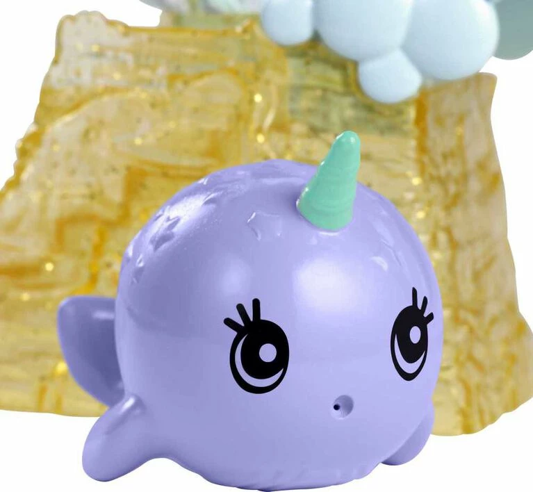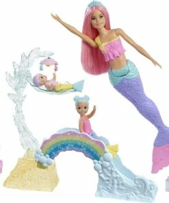 Dive into fantasy play with Barbie mermaid doll, her sweet Mertoddler and Merbaby friends and the whimsical Barbie Dreamtopia Mermaid Nursery playset! A slide, rocking swing and underwater theme with pastels and rainbow details set the scene for magical storytelling. Lay Merbaby down in her rotating swing and spin the mobile for her. Then, sit Mertoddler in her clamshell seat or help her go down the slide. Push narwhal down the slide, too, or fill with water and use as a squirt toy for fun water-play! Barbie Mermaid doll, Mertoddler and Merbaby each feature colorful, sea-inspired tops and tails, and Barbie doll wears a tiara accessory in her pastel-pink hair. Each doll bends at the waist so little storytellers can easily play out swimming, sitting or sliding fun. Young imaginations will love playing out favorite scenes and fairytale dreams because when you enter Dreamtopia, you wake up to a world where dreams become reality! Collect all the Barbie Dreamtopia dolls and toys and let your dreams set sail (each sold separately, subject to availability). Barbie Dreamtopia Mermaid Nursery playset makes a great gift for 3 to 7 year olds. Includes Barbie mermaid doll, Mertoddler doll, Merbaby doll, narwhal squirt toy, nursery playset with rocking swing, slide and accessories. Colors and decorations may vary.
