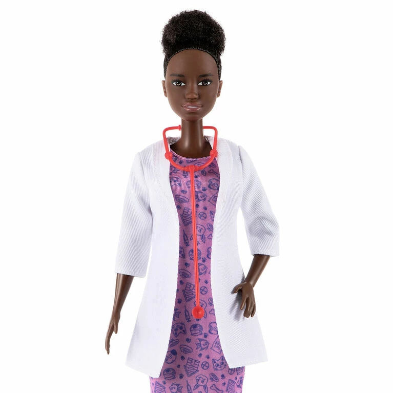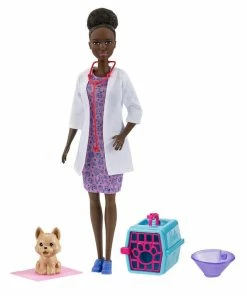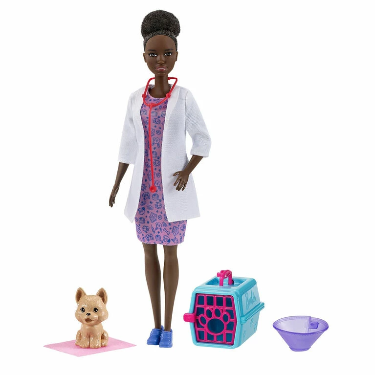 Explore a world of career fun with Barbie pet vet doll and playset! When a girl plays with Barbie, she imagines everything she can become and if you love taking care of animals, you can be a pet vet. The playset includes the Barbie pet vet doll (12-in/30.40-cm)dressed in a cute animal print dress with a white smock and stethoscope. Playset also includes a cone, pad and pet crate to help Barbie doll take care of her furry patient. Kids will love the endless possibilities for creative expression and storytelling fun! Doll cannot stand alone. Colors and decorations may vary. Makes a great gift for ages 3 years old and up.
