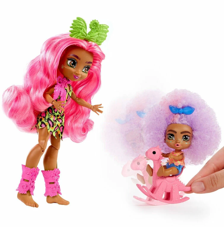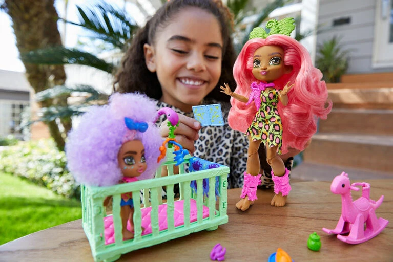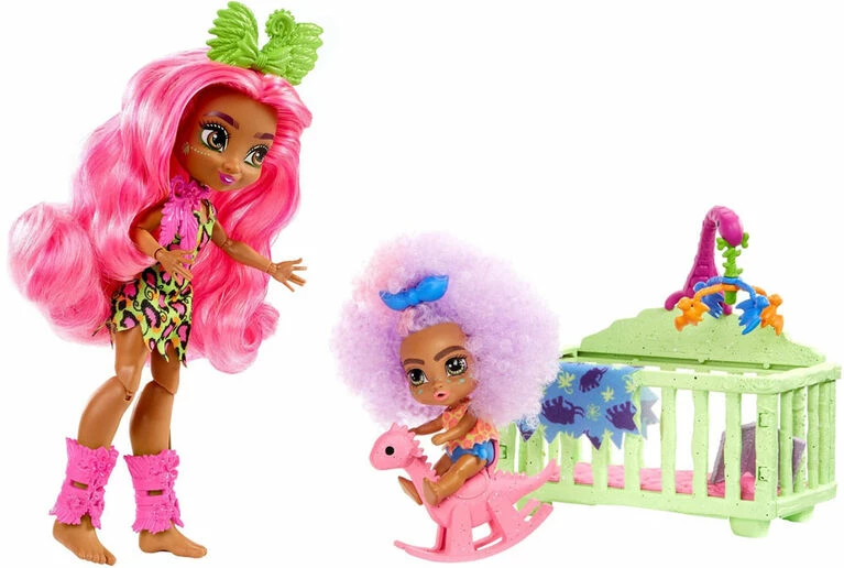 With Cave Club dolls and playsets, kids can travel back in time and discover epic storytelling adventures with their favorite prehistoric characters -like Fernessa, the first babysitter! Fernessa doll has everything she needs to rock her babysitting gig, including a crib with an adorable dinosaur-themed mobile that spins to spark sweet dreams. When nap time is over, clip Cave Tot Furrah doll onto the rocking dino-horse and give her a push to rock and ride. Smaller accessories let kids play out everything from snack time to story time, and two dolls in neon-bright looks inspire storytelling. Adventurers ages 4 years old and up can collect other Cave Club dolls and toys to make history with the whole crew! Each sold separately, subject to availability. Colors and decorations may vary.