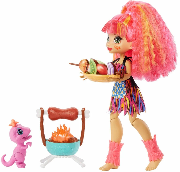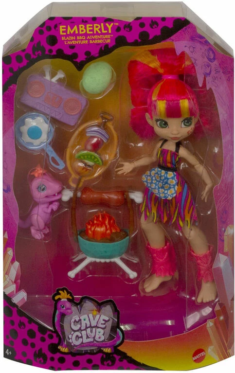 Meet the Cave Club – a truly unruly group of prehistoric kids who are way ahead of their time! With Cave Club dolls and playsets, kids can travel back in time and embark on epic storytelling adventures with their favorite prehistoric characters, like Emberly. Emberly invented fire, so it’s only natural for her to host the first BBQ! With this storytelling set, kids can help Emberly doll and her pet dinosaur, Flaire, cook up all kinds of fun. A fire pit with a rotating spit gets the story started -place a food piece over the flame and twirl to “grill!” Crank up the boombox -flip it around to see the bongo-playing birds -then get cooking with a serving tray, pan and food pieces, like a shish kabob, barbeque piece and an egg that kids can really “crack.” Transport kids to the dawn of time and let them discover wild new stories with Cave Club playsets! Adventurers aged 4 years and older can collect other Cave Club dolls and toys to make history with the whole crew. Each sold separately, subject to availability. Colors and decorations may vary.