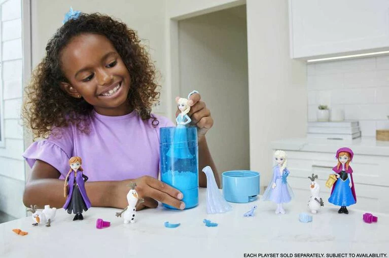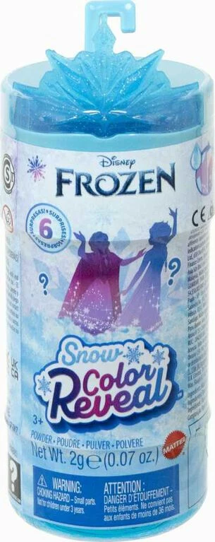 An exciting unboxing experience comes to the Disney Frozen assortment of small dolls! Fans will love these Snow Color Reveal dolls – but which character will they get? Each doll is a mystery until water is added, activating the snow-like compound to reveal the character. Five additional surprises are included for more unboxing fun: a cute character friend and 4 more accessories, including a cape and ring for the child! Each doll sold separately, subject to availability. Dolls cannot stand alone. Colors and decorations may vary.