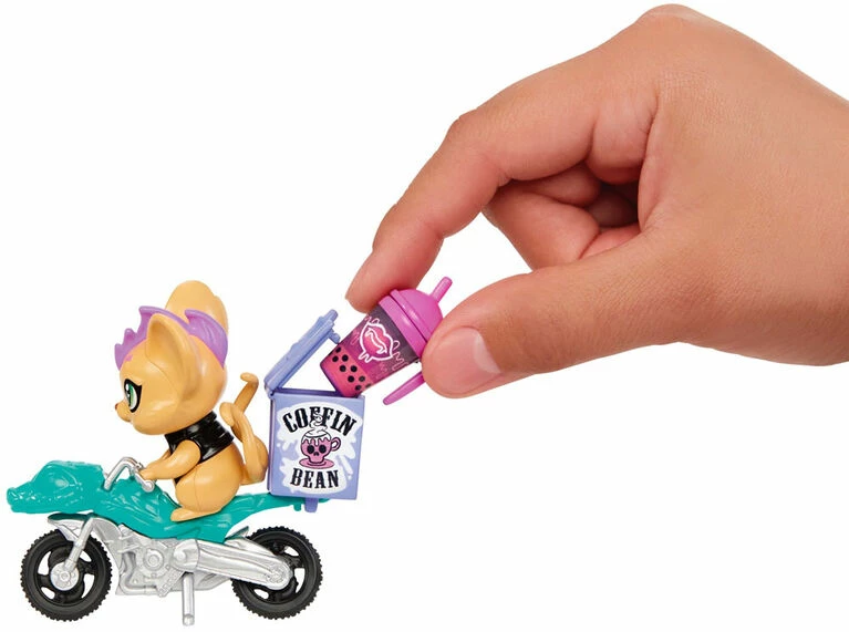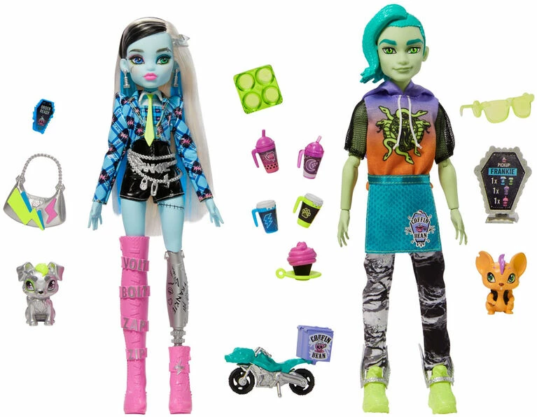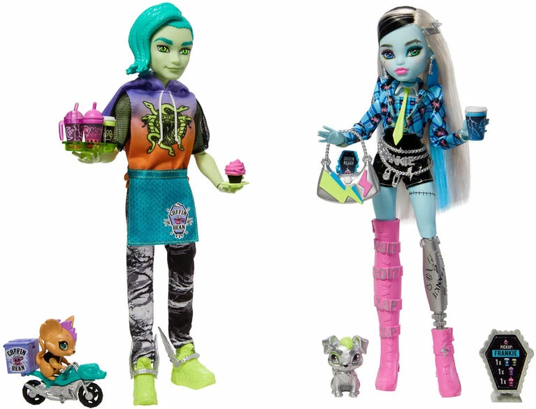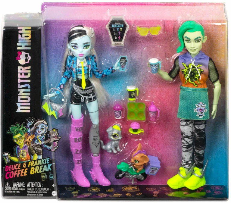 With Boo-ology midterms coming up, Frankie Stein wants to treat themself to a dreadfully delish drink! Frankie Stein stops by the Coffin Bean, and Deuce Gorgon whips up an eek-spresso to get his friend’s volts zapping so they can bolt to class. The Frankie and Deuce Coffee Break doll two-pack offers expanded play for the much-adored Coffin Bean café, including spooktacular accessories to enhance storytelling. Deuce Gorgon doll’s mouse Perseus zips through the hallowed halls of Monster High on his bike, delivering piping hot creep-uccinos to its busy students. Meanwhile, Frankie Stein doll’s pet dog Watzie shines in metallic silver! Dolls cannot stand alone. Colors and decorations may vary.