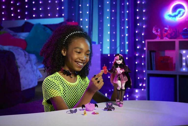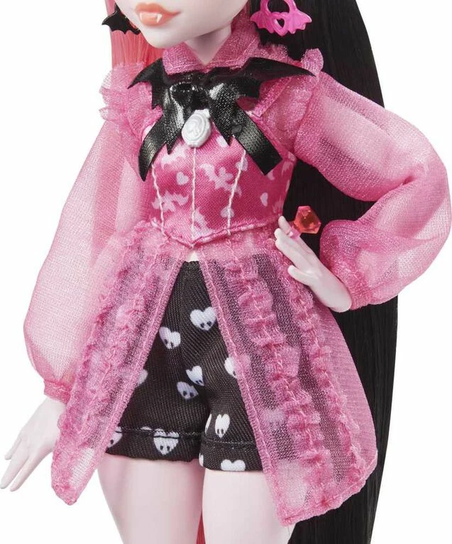 School is back in session, and the Monster High ghouls are showing up in scream-tastic style! Draculaura doll struts down the Monster High hallways in a fang-tastic fashion featuring heart-print shorts and a vampy corset blouse with sheer sleeves. Her freaky-fabulous, vampire-inspired look is complete with sheer, ruffled stockings, pink platform shoes, and a headband and sunglasses with batty details. Take Draculaura doll’s look to the next level with a scary-chic cape and accessories. And inspire spooktacular storytelling with her creepy-cute pet bat, Count Fabulous! Doll cannot stand alone. Colors and decorations may vary.