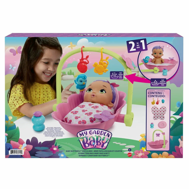 This My Garden Baby Baby Butterfly Bath & Bed is a 2-in-1 bath & bed that makes for a magical bathtime and bedtime routine! First, fill the tub with water for bathtime! Then, wash My Garden Baby (sold separately) squeaky clean with the soap bottle as she makes a splash with her rubber birdie and color-change bath toys. When finished, dry her off with the towel. Empty the tub, flip up the handle, and hang toys up for bedtime. Tuck My Garden Baby in with the pillow and cozy blanket so she can flutter into sweet dreams! Doll not included. Works for most 12″ My Garden Baby dolls. Colors and decorations may vary.