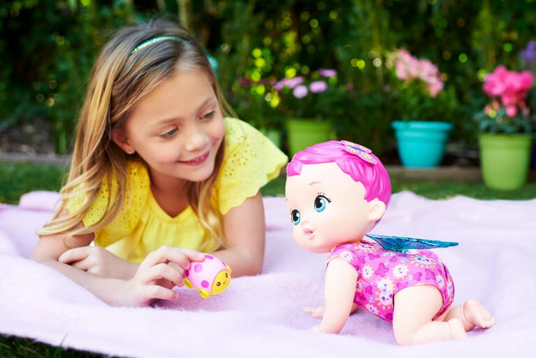 R Exclusive, only available at Toys R Us Canada. This My Garden Baby doll (12-in / 30.5-cm) loves to giggle and crawl! Just tap her wings to see her move and make 20 baby sounds for hours of interactive play. She coos, giggles, and babbles. As she crawls, her wings flap, too! Also included is a sweet ladybug on wheels so My Garden Baby doll can follow or crawl alongside her critter friend. Born with adorable wings, a butterfly atop her head, and a sweet jasmine scent — My Garden Baby just wants to be cared for. Hearts will flutter over this curious baby butterfly! Colors and decorations may vary.