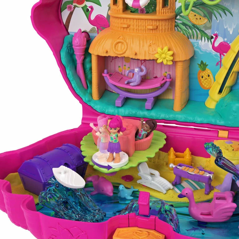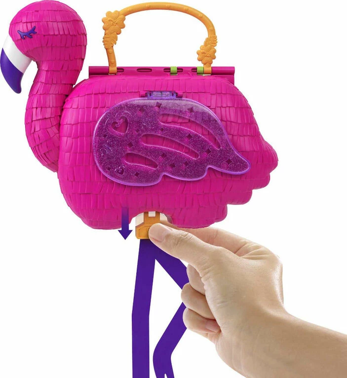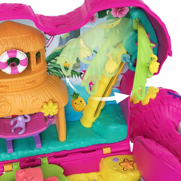 Get ready for tropical party fun with the Polly Pocket Flamingo Party playset! Shaped like an adorable flamingo, this larger-sized compact also has a handle for portable play. Pull the leg tabs and watch the colorful stream of confetti and 26 surprises fall from the playset. Some surprises are wrapped to save for later or to unwrap right away! Many surprises have a Pop and Swap feature that lets kids peg the pieces into different areas of the compact. The playset opens to reveal a fun tropical adventure with micro Margot and friend dolls. There are so many fun things to do and explore: clip a doll on the palm tree trunk to climb up and down; clip the monkey on the tree and the doll can clip to the monkey and swing; flip the big leaf on the hut to reveal a banquet and spinning dance floor; the treasure chest opens to reveal storage; peg Pop and Swap accessories on the hut roof, treetop, beach and water; attach surfboard, flamingo floatie and dolphin onto the wave and more. There are so many options and endless play possibilities! Colors and decorations may vary. Makes a great birthday and holiday gift for ages 4 years old and up.