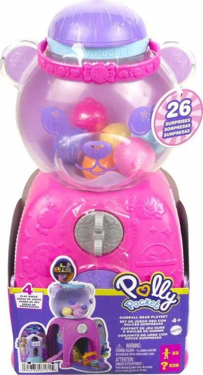 It’s beary sweet fun with the Polly Pocket Gumball Bear Playset! This gumball machine features 4 play spaces and 32 total play pieces (includes micro Polly and Shani dolls, 6 gumballs and more). The playset sides extend down and the bear’s cap opens to reveal a sweet treat cafe. Turn the candy wheel to reveal the front panel and continue turning to dispense the non-edible “gumballs” with surprises inside! Discover activities like a gingerbread house that opens; a cash register with a pop-up receipt; serving ice cream; sliding down an ice cream mountain; a spinning chocolate piece; a candy dispenser hideout; and a display of spinning candies. Some pieces have a Pop and Swap peg feature to plug into different playset areas. Colors and decorations may vary. Makes a great gift for ages 4 years old and up.