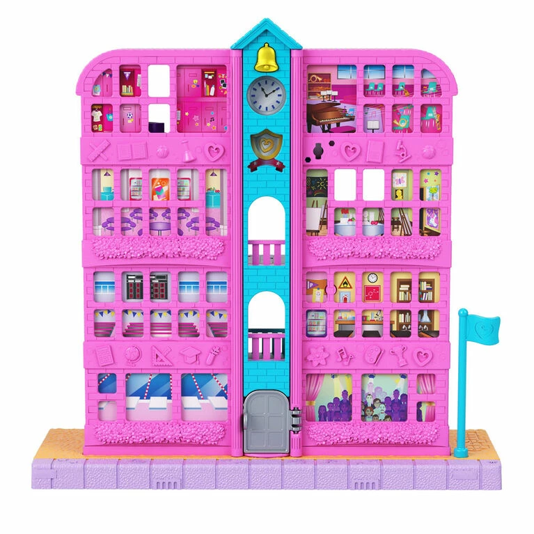 School time is so much fun at the Polly Pocket Pollyville Mighty School! The school opens to a fun learning-inspired adventure with 12 accessories that can be placed anywhere inside or outside to play out the storytelling fun! The school opens and extends to include 3 floors of fun, 7 play spaces, micro Polly and Shani dolls (with 5 movable joints for pose and play) and 12 micro accessories to customize the play space. There’s so much to discover and do: gather at the assembly hall (fold down to reveal stage), serve food at the cafeteria and sit at the lunch table; play basketball or climb the rope in the gym; sit in the classroom and study (chalkboard opens up and down); hang out in the locker hallway and open the locker to grab books; play piano, drums and guitar in the music room; and play hopscotch, race outdoors and more! Accessories include a bag, guitar, microphone, easel, canvas, basketball, desk, cafeteria table, 2 school chairs, volleyball net and stadium seat. It’s school fun all in one! Create even more stories as you build out and customize your world with Pollyville stores, vehicles and more! Kids can collect them all (each sold separately, subject to availability). Colors and decorations may vary. Makes a great gift for 4 years old and up especially those who love school and learning!