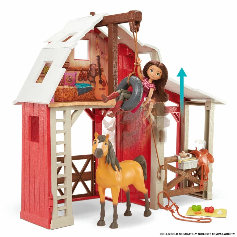 Be a part of the friendship, bravery and adventure with DreamWorks animated film, Spirit Untamed! The Barn playset is perfect for playing out the fun and learning how to feed, groom and take care of horses! The playset features a large barn with 4 areas to play including a stable, clubhouse, feeding and grooming area and tire swing. The playset also includes Spirit horse (approx. 8-in/ 20.32-cm) and 10 storytelling pieces: a saddle, bridle, trough, mat, brush, grooming brush, 2 carrot horse treats and 2 apple snack horse treats. Fun details like a tire swing that doubles as an elevator for a doll (sold separately) to reach the clubhouse, an opening gate, hooks for hanging items and more create a fun, realistic play experience! Colors and decorations may vary. Makes a great gift for ages 3 years old and up.