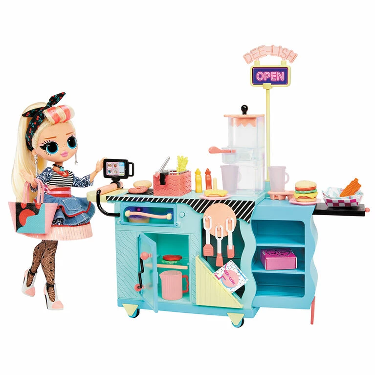 Introducing the first-ever L.O.L. Surprise O.M.G. To-Go Diner Playset! Welcome to Dee-Lish Diner, where Miss Sundae is serving up the tastiest burgers and fries in town. Don’t forget to check out the dessert, there’s cherry pie on the menu! Unbox 45+ surprises with this all-new O.M.G. playset, including an exclusive fashion doll, Miss Sundae, and interactive color change features. Miss Sundae also comes with a convertible outfit for multiple looks and is articulated for tons of poses. The playset includes both water and UV color change surprises. Pop the pie in the oven and turn on the light, watch it bake! Ready for a bite to eat? Place a burger on the grill, don’t forget to press down the patty for real grill marks. Fill the fryer with warm water and drop in the fries to cook! Feeling thirsty? Pour an ice-cold drink from the dispenser and discover which lemonade flavor you have! The ice cube tray can make real ice cubes too! Each playset includes a L.O.L. Surprise O.M.G. fashion doll, an extendable playset, a drink dispenser, an iPad register, multiple cooking utensils & kitchen accessories, a menu, food accessories, a fashion outfit, a hairbrush, and a doll stand. Check out this new play experience brought to you by L.O.L. Surprise in the O.M.G. To-Go Diner Playset and discover what yummy adventures await!