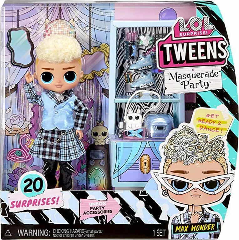 Welcome 2 wonderland! Ur invited to the party of the year with the L.O.L. Surprise Tweens Masquerade Party fashion doll, Max Wonder. Always a rebel, he dreams of becoming a boy band star one day. Following his own beat, Max is always ready to groove into party mode! Dress him in his party blazer, kilt, and dancing shoes and he’s ready to party with an all-new look! Unbox 20 surprises, including a Tweens fashion doll, showcasing his cool features, styled hair, and his own pop-punk style. Each box includes a L.O.L. Surprise Tweens fashion doll, a fierce party outfit, a hoop earring, 2 pairs of shoes, a blazer, a kilt, a bunny-inspired crossbody bag, a masquerade mask, a portable CD boombox, hairspray, a flower corsage, playing cards necklace, a hairbrush, and a doll stand. The fashion boy doll is not anatomically correct. Collect all L.O.L. Surprise Tweens Masquerade Party fashion dolls: Jacki Hops, Kat Mischief, Max Wonder, and Regina Hartt!