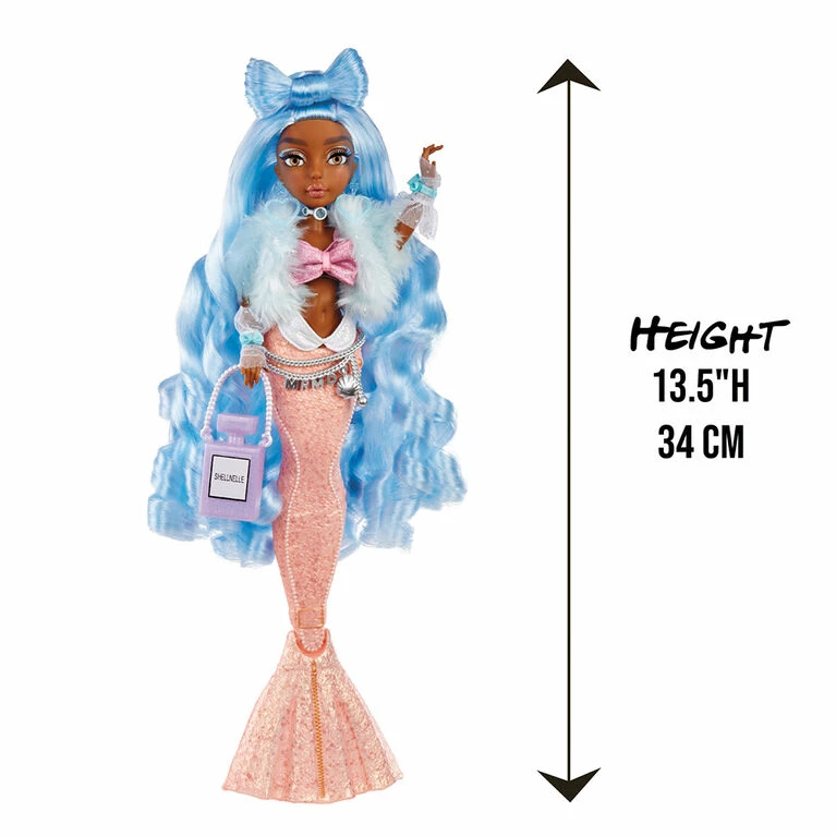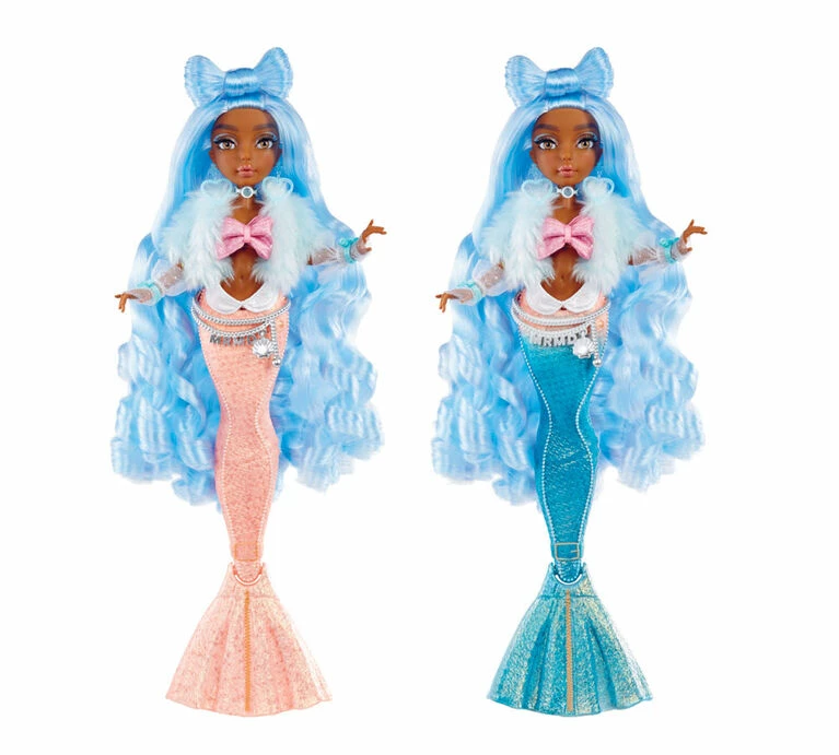 Beyond the waves, beneath the surf, into the deep blue… follow the fabulous fins of Mermaze Mermaidz to discover something amazing! Kishiko, Jordie, Harmonique, Riviera, and Shellnelle are mermaid BFFs with their own distinct personalities and mermazing color change tails! Each Mermaze Mermaidz doll has a unique, sculpted tail that performs a magical, dramatic color change when submerged in water. Shellnelle’s tail changes from coral to teal blue when it comes in contact with cold water. Her tail also doubles as a stand when the fin is bent 90 degrees, so she can really stand on her own! Each Mermaze Mermaidz doll has articulation points at the neck, shoulders, elbows, wrists, torso, waist, and fin to allow for so many poses!