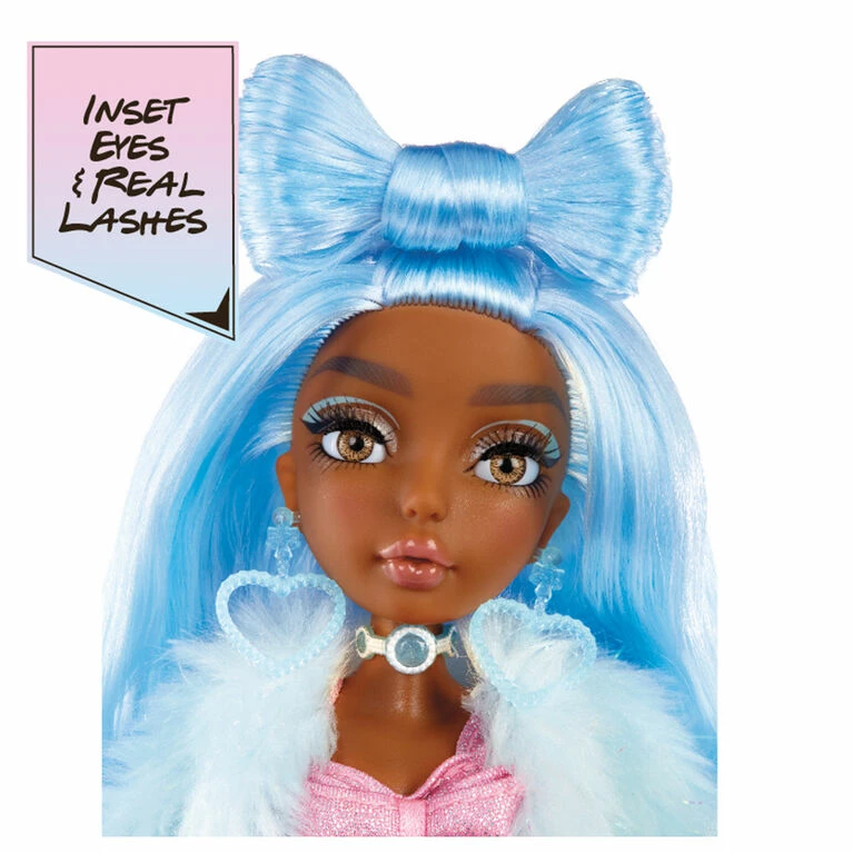 Shellnelle has beautiful, premium blue hair styled with a large hair bow on the top of her head. She has gorgeous glass inset eyes and real eyelashes, as well as fantasy makeup complete with blue cut creases and shimmery shadow. Shellnelle is wearing a sparkly pink bow top, faux fur blue jacket with tinsel, fabric collar belt, and mesh cuffs. She accessorizes with heart earrings, a choker necklace, MRMD charm belt, and Shellnelle purse.