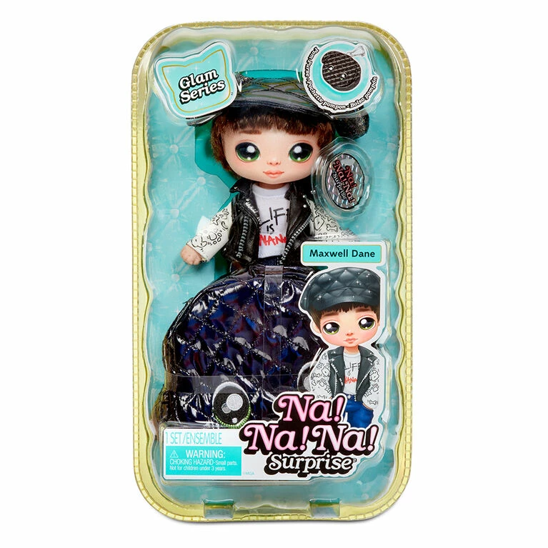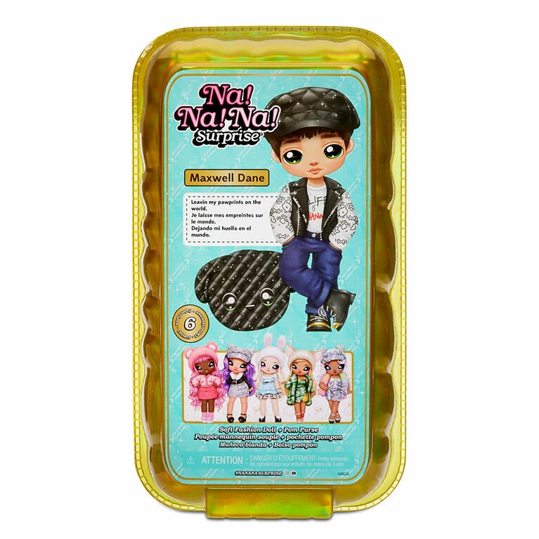 Level up your glam game with the Na! Na! Na! Surprise 2-in-1 Soft Fashion Doll Glam Series! You get 2-in-1 value with a soft fashion doll plus a collectible clip-on metallic fabric animal pom purse! Taking sparkle to the next level, the glam series features eye-catching metallic fabrics in the animal-inspired doll fashions and purse which has a convenient cute, animal-shaped clip to attach to a backpack or larger purse. Na! Na! Na! Surprise dolls are the first-ever soft, posable fashion dolls with printed face and fashion details. Now featured in a window box to show off all the quality details, it will be easier than ever to collect them all!​ Maxwell Dane comes with a tag with his name, birthday and a little about him. The Glam Series includes 6 adorable soft fashion dolls and metallic fabric pom purses to collect.