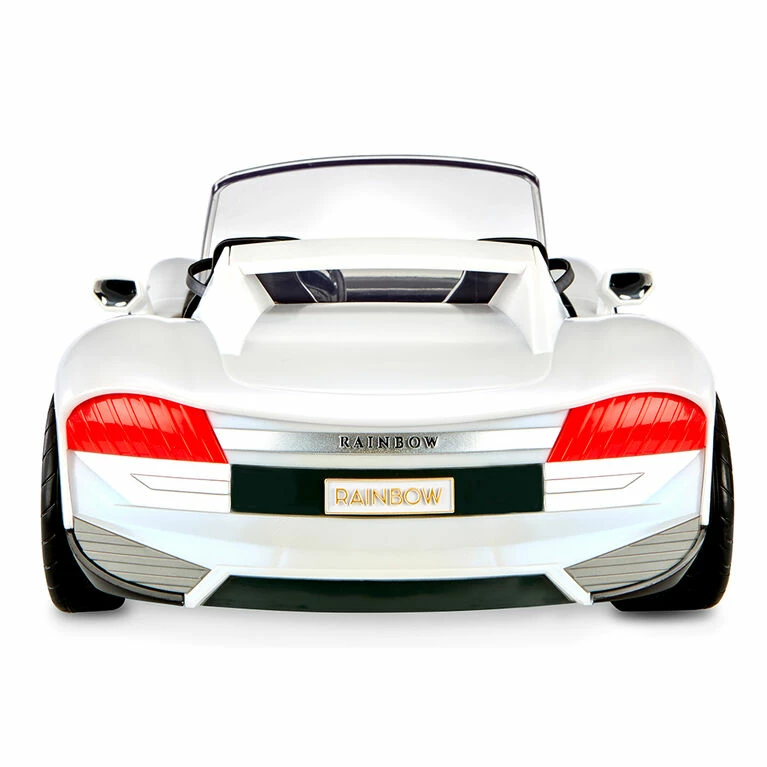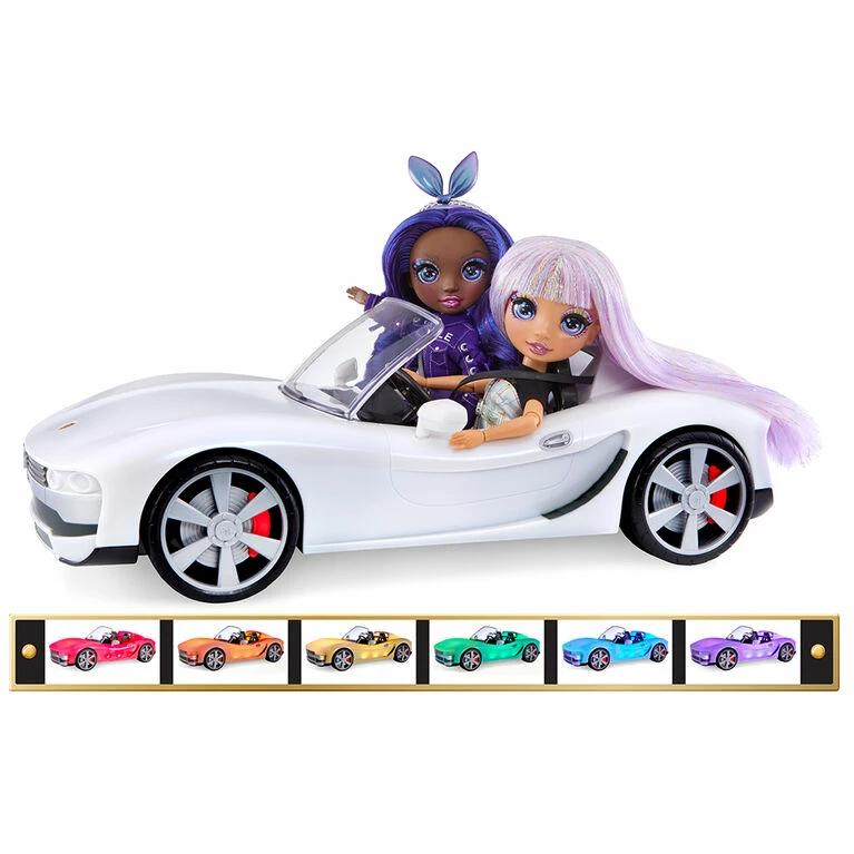 Pull up to Rainbow High in style with the Rainbow High Convertible Color Change Car. Take your favorite Rainbow High Dolls out for a spin. Why settle for one color Car when you can have the rainbow? Rainbow High Color Change Car features a white body with 8-in-1 LED Color Changing Car, black interior with RH logo monogram seats, two-seater sporty convertible that fits 2 Rainbow High Fashion Dolls with working seat belts to keep your dolls safe. The car starts white and then you can choose any color in the rainbow (white, red, orange, yellow, green, blue, or purple) or cycle through all of them! LED color changing lights is easy to operate by pressing the gold button on the hood of the car to select your car color. Each color turns off automatically after 30 seconds to conserve the battery. Turn the corner to get to your fave hang out spot with the working steering wheel and wheels that move. Rainbow High logo details, silver trim accent trim and grill. A personalized license plate adds a signature style. To make it super easy to get your dolls in and out of the car, you can shift the steering wheel up and down, pull the seatbelt out from the waist position, and you can even remove the windshield if you’d like for easy access. Watch the Animated Series on YouTube and Netflix! Just search for “”Rainbow High Dolls. Collect the rainbow! Krystal Bailey, Amaya Raine, Stella Monroe, Bella Parker, Karma Nichols, River Kendall. Rainbow High Fashion Doll and AA Batteries not included and sold separately.