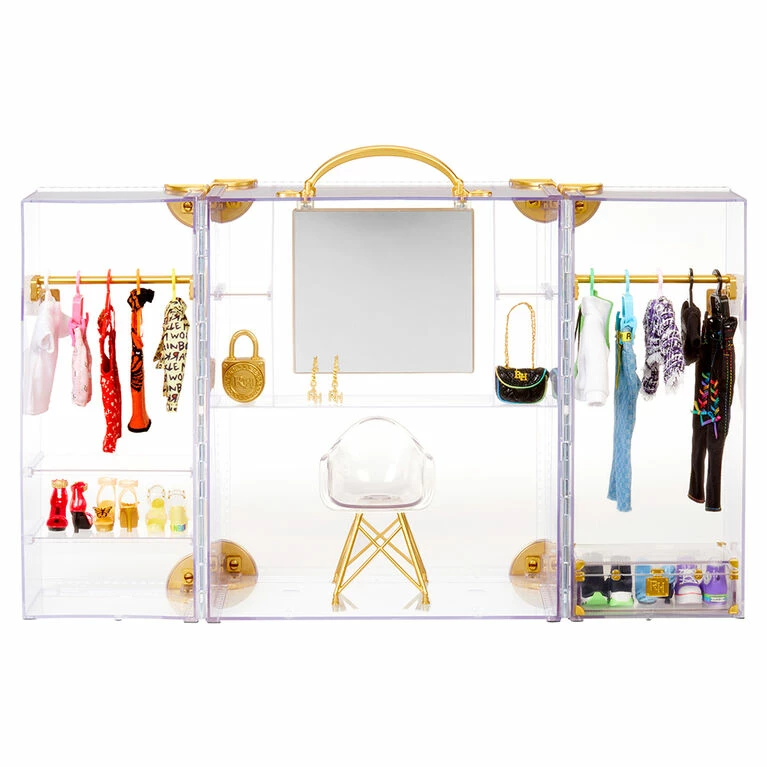 Rainbow High Deluxe Fashion Closet includes a rainbow of fashions (doll clothes and doll accessories) that you can mix and match to create 400+ glamorous looks. Enjoy endless hours styling your dolls with the 31+ Fashion forward pieces and lots of doll accessories. After you dress your doll, she can sit in her acrylic chair and admire herself in the vanity! And there’s more, it’s not just a closet for storing, it’s also a fun Playset that includes a Vanity Chair and Mirror. When finished playing, pack up and lock up your clear super-stylish closet. And it’s portable – take it on the go with the sleek golden handle!