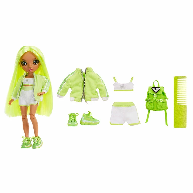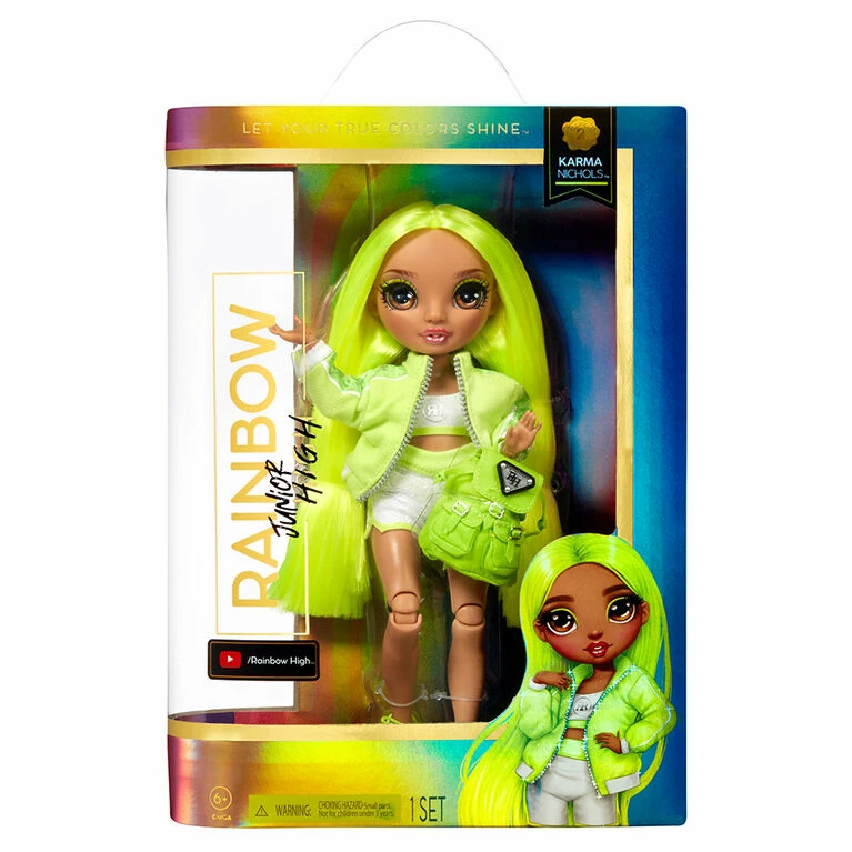 Rainbow High inspires creativity! Go back in time and meet your favorite students Bella, Stella, Karma, River, Krystal, Amaya before they became friends and followed their creative dreams to Rainbow High. Each themed playset comes with a complete doll outfit, doll with new younger face-sculpts, and a soft fabric backpack to carry their school essentials. They have gorgeous features! Karma Nichols is dressed in her signature NEON GREEN from head to toe. She has a gorgeous younger face sculpt, detailed features in her fashion, beautiful long neon green hair, long eye lashes and glass eyes. Collect the Rainbow of all the gorgeous Jr High fashion dolls.