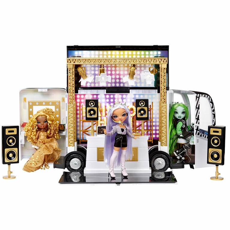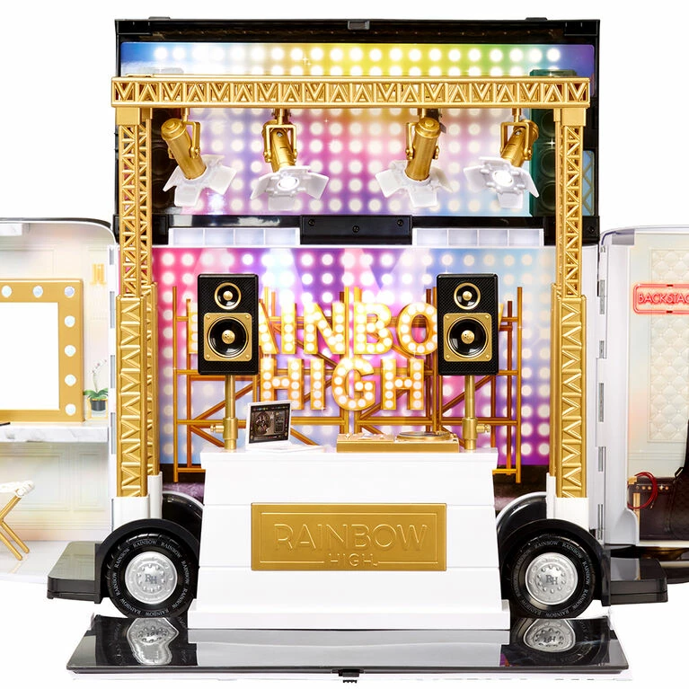 Rainbow High inspired kid’s imagination. The best of the best Art Schools from around the world will compete in an elite music high school competition, Rainbow Vision. Competitors from around the world will let their true colors shine in one epic battle to determine ONE WINNER. Play out the full storyline with the official Rainbow Vision Tour Bus and Stage playset. This playset is perfect to go on tour and set the stage for Rainbow Vision performance. Get the party started at the DJ Booth, set the stage, and glam up together at the vanity station. Dolls sold separately.