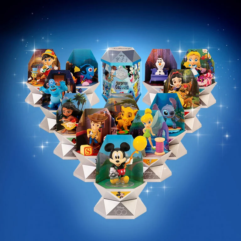 Bring the magic of Disney home with our Disney 100 Surprise Capsules! Use the interactive clue cards to reveal the surprise character and 2 accessories. Transform the capsule into a stand and display your collection! With an assortment of different characters (including Pixar!), find your favorite and collect them all!