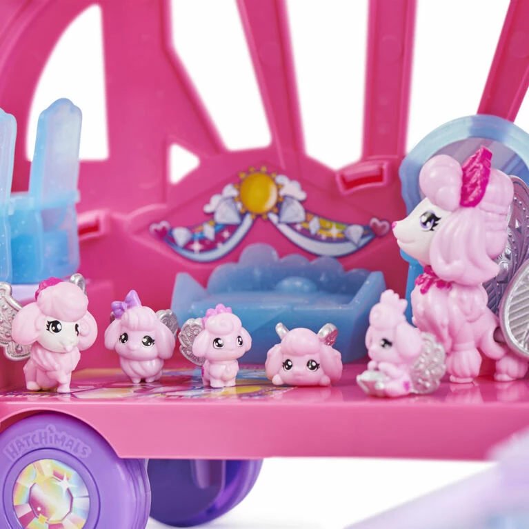 Vacation in style with the Sparkling Poodles Family and the Hatchimals CollEGGtibles Rainbow-cation Camper! Each Rainbow-cation Hatchimals Family has their own unique look and theme inspired by their favorite vacation activities. Discover nine new families, including the Wolf Bikers, Koala Campers, Llama Florists, Luau Leopards, Sparkling Poodles, Cat Dancers, Dog Pilots, rare Ice Skating Penguins and super rare Unicorn Hair Stylists – they’re all so cute! This transforming Hatchimals RV is loaded with 17 surprises to discover, including six characters, five accessories, four furniture play pieces, a slide and multiple areas to play! In the box, you’ll find one Hatchimals Mom out-of-egg, three eggs to hatch and a sticker sheet to decorate the vehicle’s interior. Crack each Hatchimals egg to reveal four sweet poodle Babies! Hatch the door open to find one Little Kid, then fold the camper open to turn it into a vacation playset for endless family fun! There’s a pop-up bed at the top, perfect for napping; a kitchen area for the Sparkling Poodles to cook up delicious meals; a slide and pool area and so much more! The furniture pieces even open, revealing the accessories hidden inside! With all of its exciting features, the Rainbow-Cation Camper is perfect for pretend play storytelling. When the Sparkling Poodles are ready to hit the road, fold the camper back up and roll to the next adventure with working wheels! With over 60 new Rainbow-cation Hatchimals to collect (toys each sold separately), complete all nine Hatchimals Families! Hatchimals CollEGGtibles surprise toys for girls are perfect for kids who enjoy cute collectibles, action figures, dolls, and small toys. They make great birthday gifts for kids, Christmas gifts, stocking stuffers, Easter basket stuffers and more! Go on the ultimate family road trip with the Sparkling Poodles in the Hatchimals CollEGGtibles Rainbow-cation Camper!