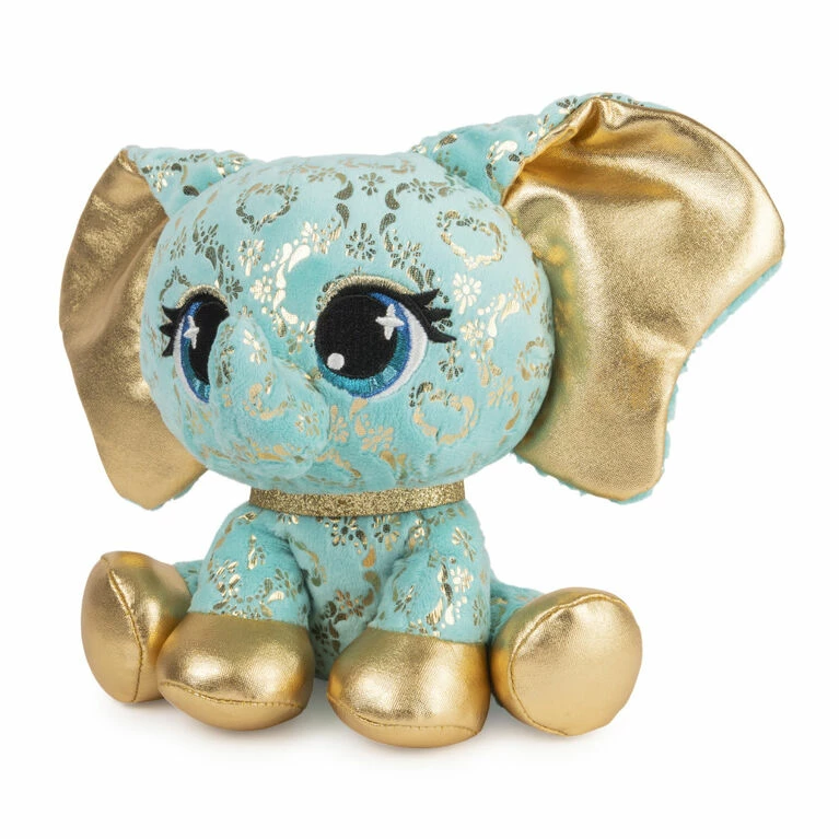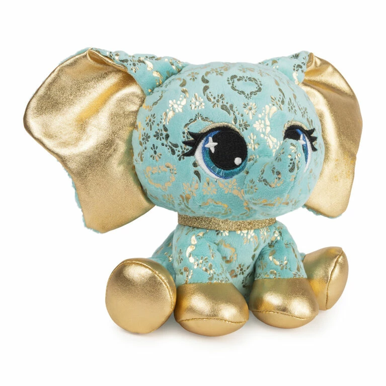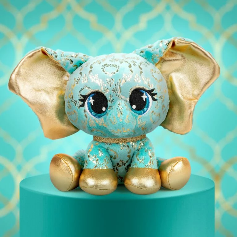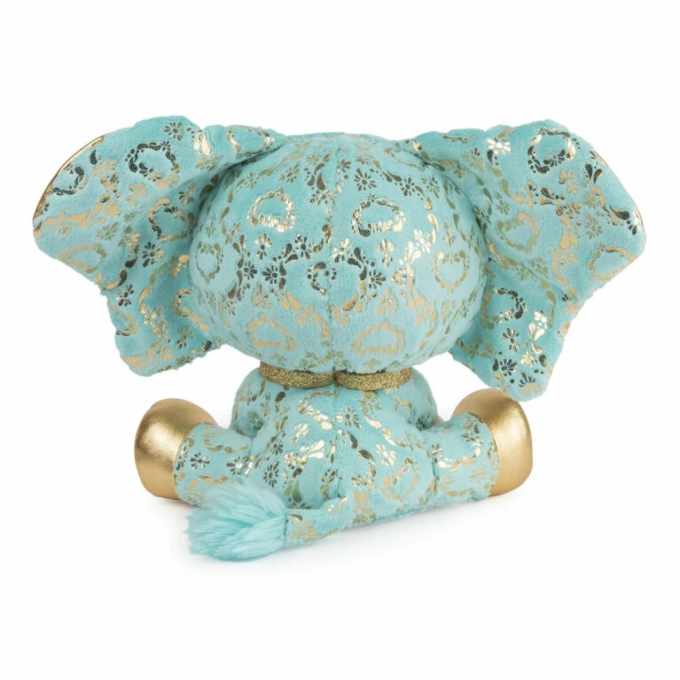 Bella L’Phante is a limited edition, exquisite elephant who brings the dazzle wherever she goes! She is covered in a gorgeous metallic gold damask pattern against her turquoise plush, adorned with metallic gold accents that match her ears and hooves. Her turquoise eyes have a pop of gold shadow that match her glitter collar, giving this gilded elephant an all-over look of luxury. Bella’s trunk is always packed for her next adventures when she isn’t hanging with friends in Houston.