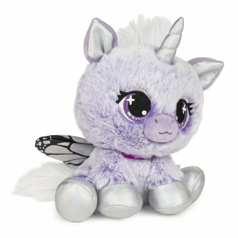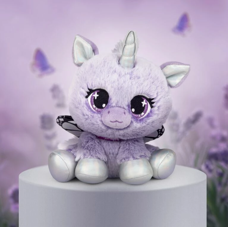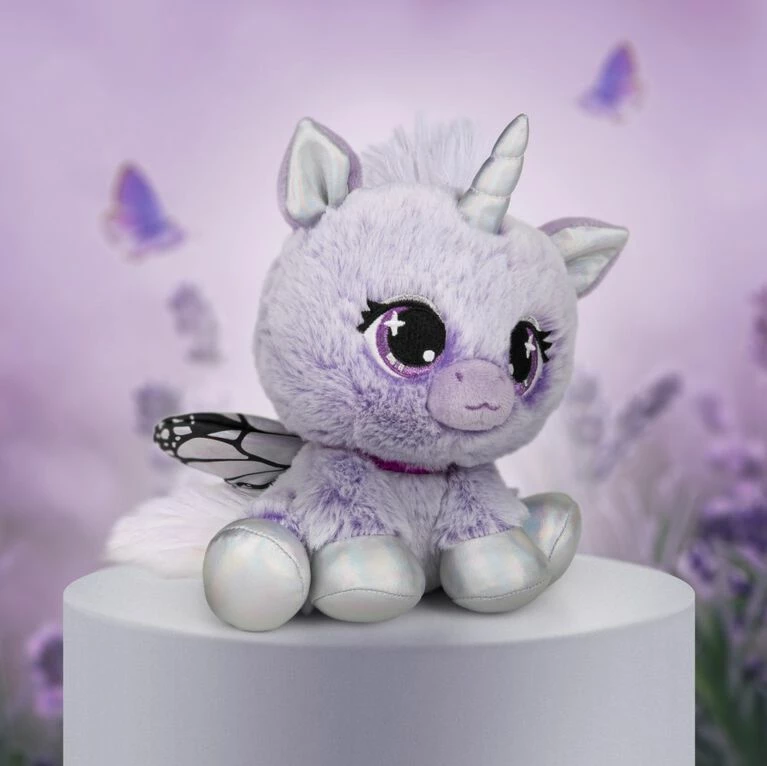 Mariah Monarch is magic from her head to her hooves – she’s definitely a diva, but is super friendly, too! This majestic unicorn is covered in soft plush that matches her favorite flower, the lilac. She features striking iridescent silver accents on her horn, hooves, and inside her ears. She also boasts dazzling purple eyes and a purple collar with platinum eye shadow. Mariah is ready to float through Tokyo on her delicate butterfly wings, which stand out between her fluffy white mane and tail.