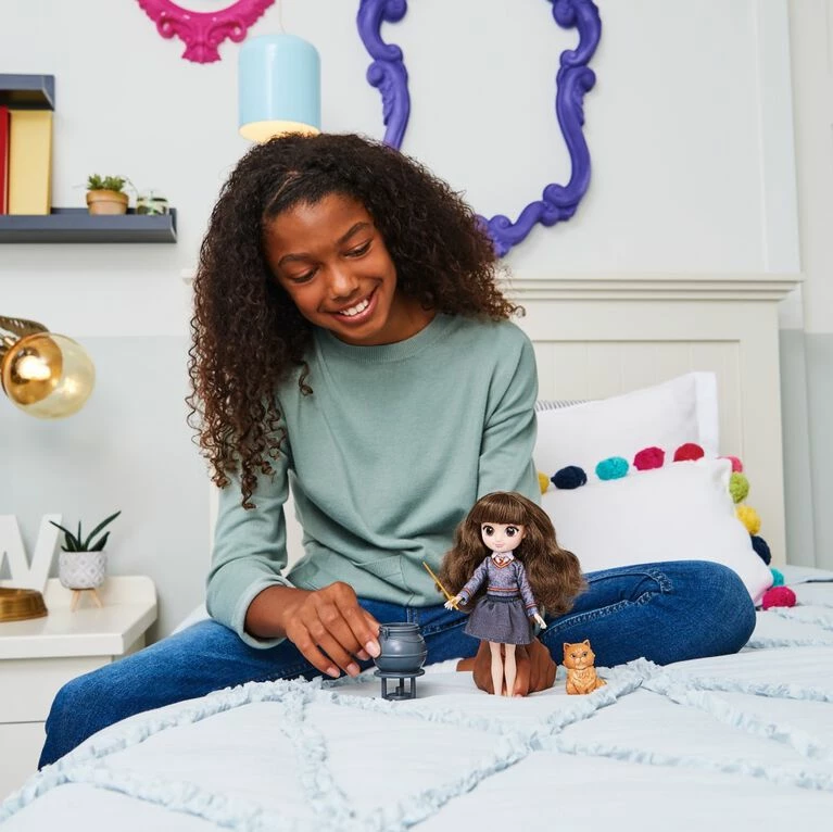 Recreate your favorite Harry Potter scenes with the Wizarding World Brilliant Hermione 8-inch doll! With two different outfits and five accessories included, the Brilliant Hermione doll is perfect for storytelling play and is a must-have for Harry Potter fans. Cute facial details, soft and extra-long curly hair and five points of articulation bring the beloved Harry Potter character to life. Brilliant Hermione is ready for endless spellbinding adventures, with two outfits to choose from! She comes wearing her pink hoodie and jeans complete with rainbow belt and removable sneakers, as seen in the Prisoner of Azkaban movie, or you can switch Hermione into her Hogwarts uniform with Gryffindor sweater and skirt! Place Hermione’s wand in her hand and pose your doll to brew up potions over the cauldron, then pretend to bottle them up with the potion bottle accessory – Hermione can really hold the bottle! Slide the Time-Turner necklace onto Hermione and recreate iconic movie scenes; plus, Hermione’s adorable pet cat Crookshanks can join in on the fun! This 8-inch Brilliant Hermione doll will inspire your imagination through fun and exciting pretend play. For more ways to build out your Wizarding World, add all of the other Harry Potter 8-inch dolls to your collection (each sold separately)! This 8-inch Brilliant Hermione doll and the 8-inch Harry Potter dolls are great gifts for girls. Experience the magic of Harry Potter with the Wizarding World Brilliant Hermione 8-inch doll!
