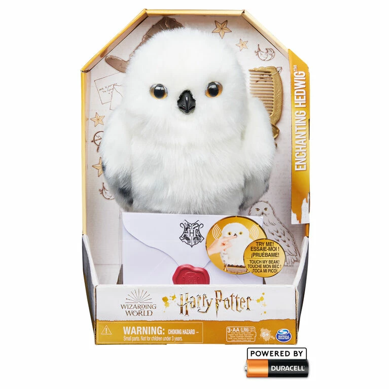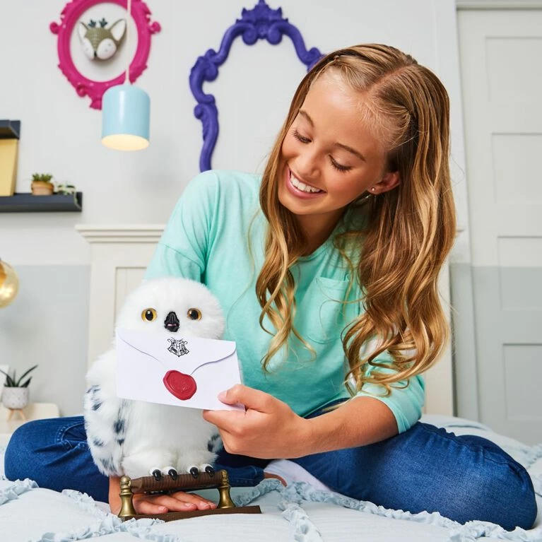 Recreate your favorite Harry Potter scenes with the Wizarding World Enchanting Hedwig! Featuring over 15 realistic sounds and movements and super soft plush material, Enchanting Hedwig brings the iconic Harry Potter owl to life. Remove Hedwig from her perch and discover all of her magical features. Hedwig loves to be pet! With “ruffle detection,” she can sense which way you are petting her. For loving chirps and head movements, pet her from front to back – she doesn’t like having her feathers ruffled backwards and will let you know how she feels about it! Place your finger in her beak and she’ll playfully nibble on it when she’s happy! Enchanting Hedwig also recognizes your tone of voice. When you speak soft and gently, she’ll respond with a hoot to show you that she is listening. If you speak too loudly, she’ll respond with some loud sounds of her own! Set Hedwig back on her perch and write a special message to a friend. Slide your note into the Hogwarts envelope and help Hedwig deliver it! She holds the envelope in her mouth and will only happily release it to the right person with a secret interactive code – stroke her head three times and Hedwig will let go of the envelope! Pet Hedwig and comb her to continue to keep her happy. Then, deliver a new message and play again and again! With so many exciting features, this 9-inch Enchanting Hedwig owl toy will inspire your imagination through fun and exciting pretend play. This interactive Hedwig plush owl is the perfect Harry Potter gift for ages 5 and up. Bring home your very own Wizarding World Enchanting Hedwig and experience the magic of Harry Potter!
