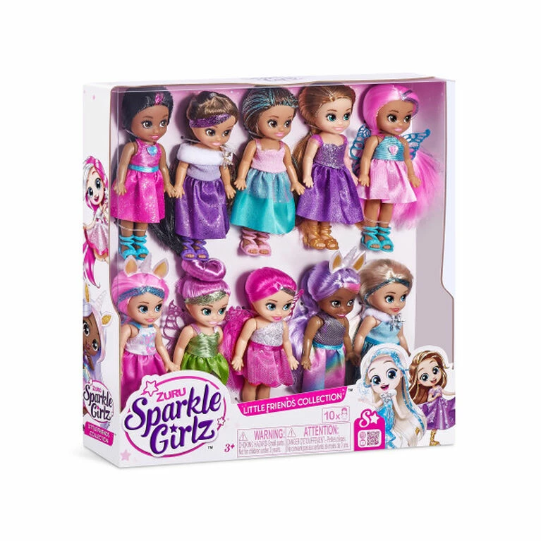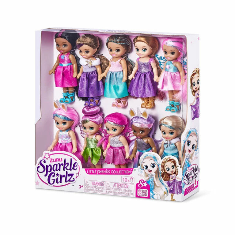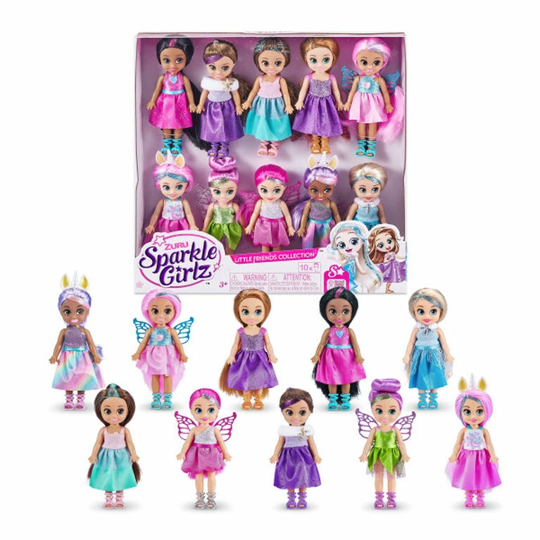 R Exclusive, only available at Toys R Us Canada. ZURU Sparkle Girlz Little Friends Set of 10 Dolls are the cutest set of friends! The perfect gift for any child. Unbox 10 different dolls, each with their own unique super sparkly outfit. Swap their outfits, brush and style their hair! Arms and legs move too so they are always ready for an adventure. So many ways to play. There are fairies, princesses and ballerina’s to collect. In the world of Sparkle Heart, each doll comes from her own magical kingdom. Get ready for some sparkle magic!